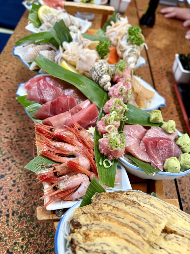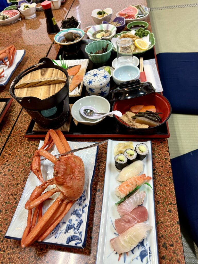 真野湾に沈む夕日を眺めながらの夕食は、食べきれない程の日本海の海の幸🍣